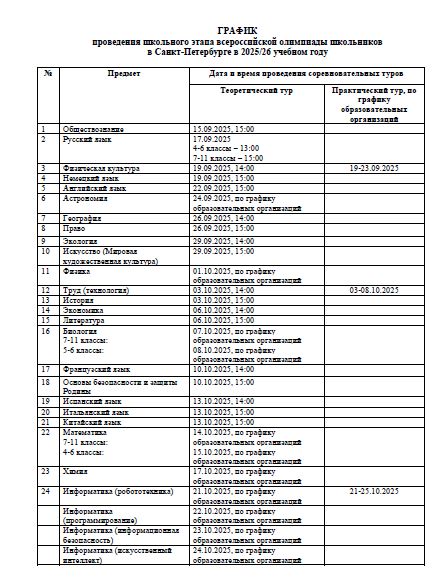 Школьный этап: срок окончания - не позднее 1 ноября. График проведения утверждается в каждом районе. На школьном этапе на добровольной основе принимают индивидуальное участие обучающиеся 5-11 классов организаций, осуществляющих образовательную деятельность по образовательным программам основного общего и среднего общего образования. Школьный этап проводится во всех общеобразовательных учреждениях. Для регистрации в этапе необходимо обратиться к учителю или заведующему учебной частью.